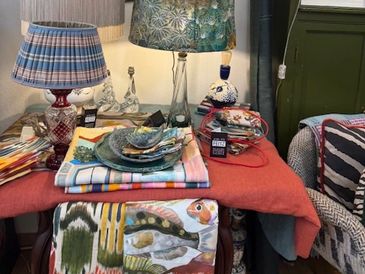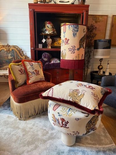 :Naast ons winkelassortiment maken we in eigen atelier onder meer handgemaakte lampenkappen in allerlei formaten geschikt voor diverse lampenvoeten. Deze kunnen ook op aanvraag gemaakt worden met stoffen uit onze collecties. Ook produceren we sierkussens in verschillende formaten en stoffen, naast de designkussens van merken zoals Designers Guild en Christian Lacroix Maison die we verkopen.